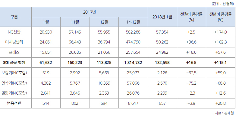 세부적으로 보면, NC절삭기계 중 NC선반(5,700만 달러, +2.5%), 머시닝센터(5,000만 달러, +36.6%)은 전월대비 증가하였다.