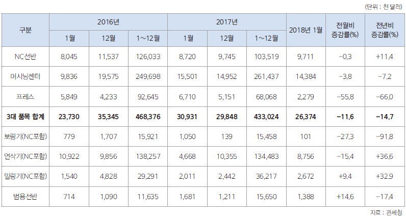 반면, 범용선반(60만 달러, -3.9%), 연삭기(NC포함/ 250만 달러, -75.2%), 보링기(NC포함/210만 달러, -62.5%), 밀링기(NC포함/230만 달러, -2.3%)는 모두 전월대비 감소하였다.