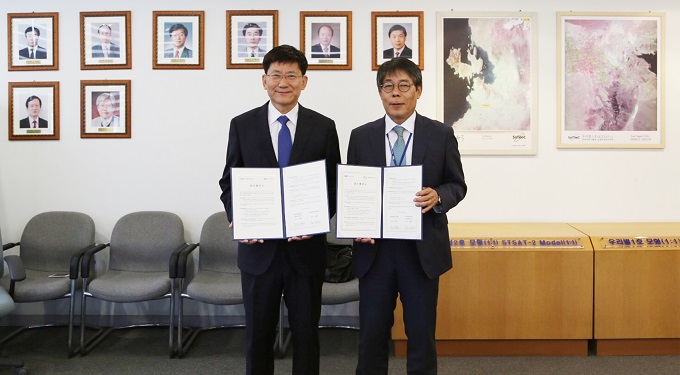 ▲ 지난 24일 KAIST 인공위성연구소 대회의실에서 KTL과 카이스트의 업무협약식이 진행됐다. 사진은 (왼)KTL 정동희 원장과 SaTReC 권세진 소장