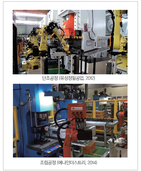 대표적인 사례를 모아봤다. 자동차 범퍼제조업체 유성정밀공업은 단조공정에서 프레스와 프레스 기계 사이에 작업자가 1명씩 배치되어 전체 공정을 수작업으로 하고 있었다. 그 프레스 공정에 다관절 로봇을 도입해 자동화했다. 자동차부품 제조업체 신기인터모빌은 플라스틱 사출물이 나오면 그 위에 초음파 기기를 이용해서 부직포를 덧대는 융착 작업을 사람이 수작업으로 했었다. 그러다 보니 작업자의 상태에 따라 제품의 품질이 달라지고 불량의 관리가 어려웠는데, 로봇을 도입해 자동화를 하면서부터 생산 품질이 일정하게 유지됐다. 그 외에도 기존 작업자가 진행하던 용접작업을 로봇을 통해 자동화하는 사업과 자동차부품 검사, 분류, 포장공정에도 로봇을 가지고 지원하는 사업을 진행했다.