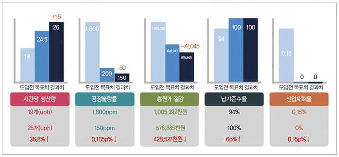 자동화를 한 이후에 이 회사는 로봇 도입 전보다 시간당 생산량이 약 37% 향상했고, 공정 불량률은 0.165p% 대로 낮아졌다. 원가 절감 또한 40% 줄었으며, 납기 준수율은 기존 94%에서 100%로 향상됐다. 산업재해율 역시 작업자 없이 로봇을 활용하다 보니 0% 대로 떨어졌다.