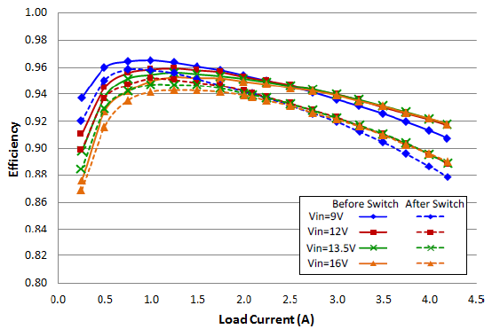 LMS3655-Q1은 AM 이하 대역에서 동작해 효율을 극대화한다. 뿐만 아니라, 최고 수준의 통합, 열 성능 및 EMC에서 동작하도록 내부 FET(field-effect transistor) 선택, 데드 타임 감소 및 기생 저항을 최소화하는 다른 기법들을 결합하여 이를 집적 회로(IC) 수준에서 설계했다[그림 5].