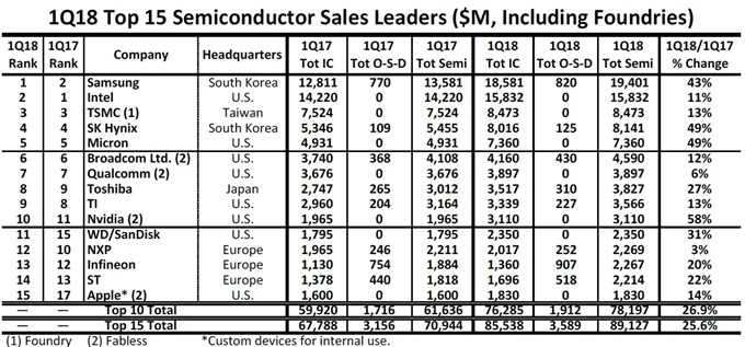 그 밖에 2018년 1분기 메모리 반도체 외의 반도체 기업 매출 순위를 살펴보면, 2위 TSMC(15억 8320만 달러), 6위 브로드컴(4억 5900만 달러), 7위 퀄컴(3억 8970만 달러), 8위 도시바(3억 8270만 달러), 9위 텍사스인스트루먼트(3억 5660만 달러), 10위 엔비디아(3억 1100만 달러), 11위 웨스턴디지털/샌디스크(2억 350만 달러), 12위 NXP반도체(2억 2690만 달러), 13위 인피니언(2억 2140만 달러), 14위 ST마이크로일렉트로닉스(2억 2140만 달러), 15위 애플(1억 8300만 달러)를 기록했다.