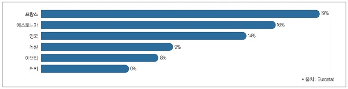 ▲ 해당 유럽 국가의 교육과 훈련에 참여하는 25~64세 인구, 2016년