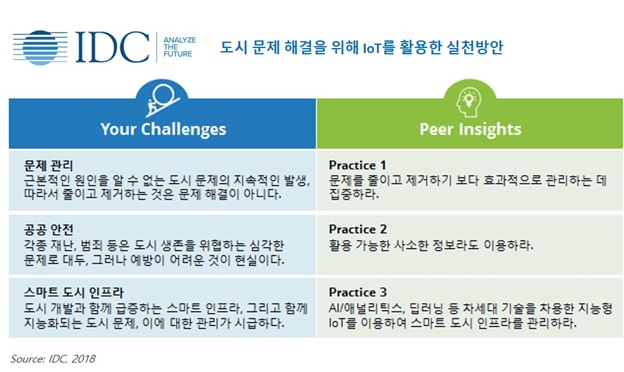 한국IDC는 최근 발표한 IDC ‘Peerscape: Practices for Solving City Problems Using IoT in Korea’ 보고서에서 국내 다양한 지방자치도시들이 스마트 시티 구축 과정에서의 도시 문제 해결을 위해 IoT를 어떻게 활용하는 가에 대한 사례를 제시했다.