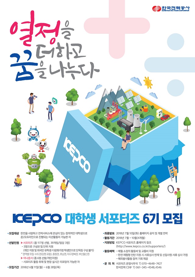한국전력이 ‘18년도 대학생 서포터즈 6기’를 모집한다.