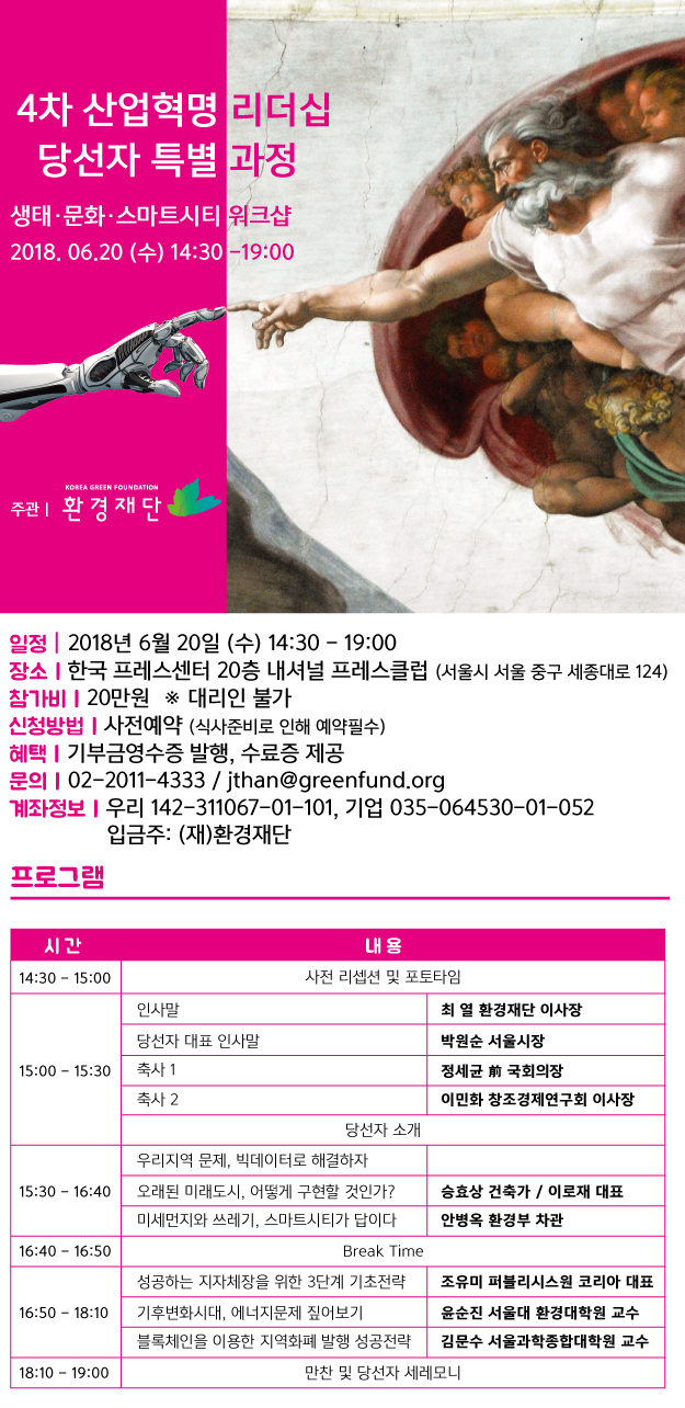 두 번째는 시대적 흐름이다. 4차 산업혁명 시대에 발맞춰 인공지능, 빅데이터, 블록체인 기술이 빠르게 도입되어야 하는 시점이다. 이에 환경재단은 각 당선자들로 하여금 4차 산업혁명의 흐름을 요약적으로 파악하고, 각 정책에 도입하여, 주민참여와 지역경제 활성화에 도움을 줄 수 있는 내용으로 특별과정을 구성했다.