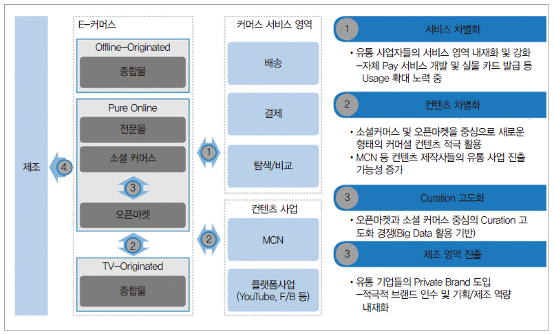 국내 이커머스 시장은 4차 산업혁명 및 다양한 디지털 혁신과 더불어 급속한 변화의 기로에 놓여있다. 오픈마켓, 소셜커머스를 비롯해 종합몰, 전문몰 등은 결제 서비스를 비롯한 제반 서비스의 다양화, 미디어 컨텐츠 차별화, 빅데이터 기반의 큐레이션 고도화, 나아가 브랜드 인수 및 프리미엄 PB 출시 등을 통해 전혀 새로운 경쟁 패러다임을 등장시킨다(그림 1 참조).
