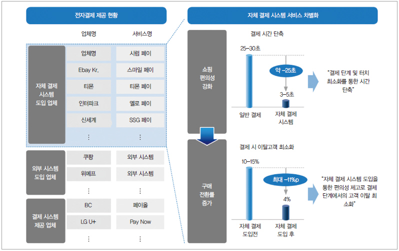 11번가, 이베이, 티몬, 신세계 등 다양한 이커머스 기업들이 독자적인 전자결제 시스템을 도입을 했으며, 구매 전환률 향상을 목적으로, 결제 단계 및 터치 최소화로 결제 시간을 줄임으로써 쇼핑 편의성 강화를 하게 되었다. 이로 인해 결제 단계에서의 고객이탈을 최소화 시킬 수 있었다고 한다(그림 2 참조).