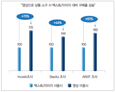 또한 이커머스 기업들은 컨텐츠 차별화를 위해 텍스트나 이미지보다 동영상 활용을 확대하고 있고 다양한 커머셜 동영상 또는 스트리밍을 시도 중이라고 한다. 미국 온라인 쇼핑몰 관계자 및 전문가에 의하면, 텍스트나 이미지 대비 영상으로 상품 소개 시 구매율이 40~70% 상승 했다고 한다(그림 3 참조).