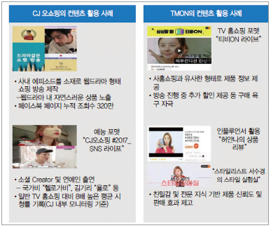 예를 들어보자면 CJ오쇼핑은 짧은 동영상으로 드라마와 예능을 구현하고 있고, 티몬은 TV홈쇼핑과 유사한 라이브 방송 등을 추진하고 있으며, 유튜브 컨텐츠로 유명한 ‘캐리와 장난감 친구들’이 뮤지컬 및 콘서트 등 문화사업으로 확대하거나, ‘블랭크 티비’에서 남성 화장품을 기획하여 런칭하는 등 컨텐츠 사업의 이종 사업 진출이 활발하다. 또한 최근 거대 컨텐츠 사업자인 CJ E&M의 경우, 윤식당 등 컨텐츠 관련 상품을 다양한 채널에서 판매하는 등 커머스 연계를 확대하고 있다(그림 4 참조).