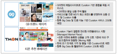 오픈마켓인 G마켓은 패밀리 사이트인 G9을 통해 큐레이션을 강화하고자 하고, 소셜커머스인 티몬은 오픈마켓을 확대하지만 ‘Managed Market Place’를 표방함으로써 여전히 큐레이션을 강조하고 있다. 초기에는 상품 전문성을 가진 MD 등 인적 역량 기반으로 큐레이션을 제공할 것이나, 점차 AI 등 기술에 의한 고객 인텔리전스 기반으로 전환이 예상된다(그림 5 참조).
