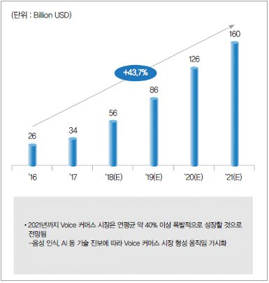 미디어 커머스 시대의 도래와 함께 신규 미디어 기반 미래형 커머스가 등장했다. 미래형 커머스는 단기적으로 음성인식 스피커를 통한 Voice Commerce 확산이 되는 것으로 인해 연평균 40% 이상 성장하여 2021년 글로벌 160조원 규모 시장 형성이 예상된다(그림 6 참조).
