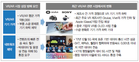 최근 VR/AR 관련 기기 가격의 대중화 및 5G 시장의 상용화로 VR/AR 관련 시장의 폭발적인 성장이 예상 된다. 기존 고가의 디바이스와 다량의 데이터 전송을 위한 네트워크 등 가격 및 인프라 차원의 장벽이 대폭 해소되며, 제조사간 경쟁 심화 및 중국기업의 시장 진출로 인해 가격 인하 추세이다. 하지만 5G 시장이 열리게 되면서 데이터 전송에 대한 문제는 크게 해소될 전망이다(그림 9 참조).