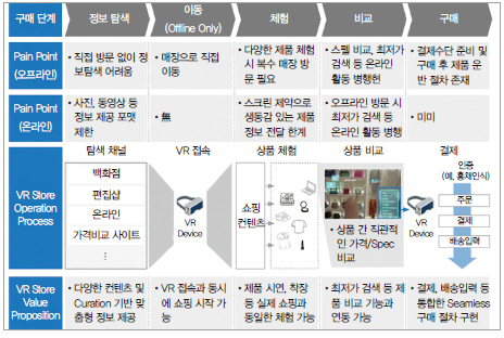 VR은 고객의 구매과정에서 각각 오프라인과 온라인 채널이 지닌 한계를 해결해 줄 수 있을 것으로 전망되며 이는 미디어 커머스의 성장에 크게 기여할 것으로 보인다. 채널 및 상품의 탐색, 상품 체험, 비교 등에 있어서 과거 유통채널이 지닌 문제를 해결 가능하다(그림 10 참조).