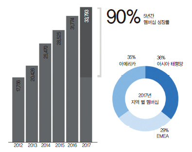 블루투스의 5가지 커뮤니티중 첫 번째인 성장에 대해 보자. 보고서에 따르면 블루투스 SIG의 멤버십은 꾸준히 성장하고 있다. 작년 2017년까지 블루투스 커뮤니티는 전세계 곳곳에 33,000개 이상의 회원사를 확보하며 성장해 왔다. 이것은 진정한 의미의 ‘세계적인’ 블루투스 기술의 역사를 쌓아온 것이다. (그래프 1. 참조)