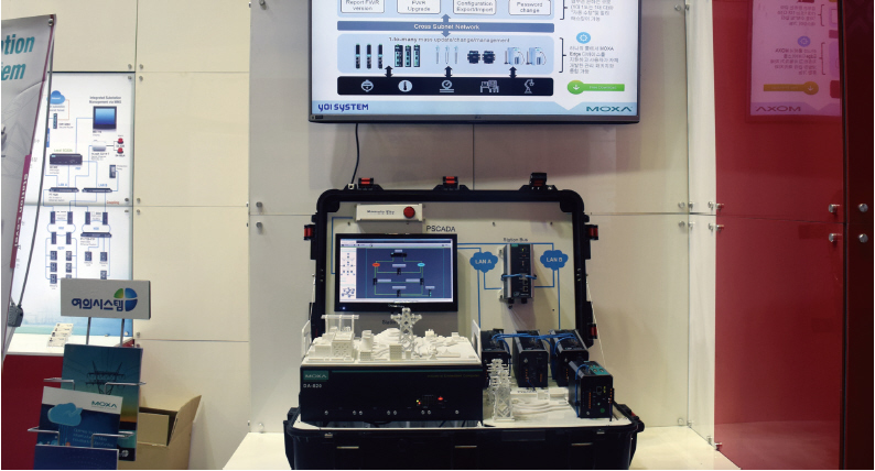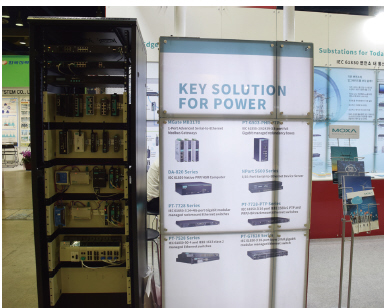이번 전시회에서 여의시스템은 주요 제품으로 MOXA 네트워크 장비를 선보였다. MOXA 네트워크 장비는 IEC 61850-3, IEEE 1613(전력 서브스테이션) 규격을 충족한다. IEC62439-3에서 정의하고 있는 PRP/HSR 제로 시간 중복성을 제공하고, RSTP그룹화 기능을 사용해 다중의 HSR 및 RSTP 결합도 가능하다. 전력 애플리케이션의 SCADA 시스템 용의 MMS 데이터 모델링을 구축했고, PT-7728-PTP는 24+4G 모듈러 이더넷 브리지로, 실시간 애플리케이션에 대해 최대의 네트워크 가용성과 유연성을 제공하여 제로 시간 페일오버 및 PRP, HSR, RSTP 프로토콜 사이의 상호운용성이 가능하다.