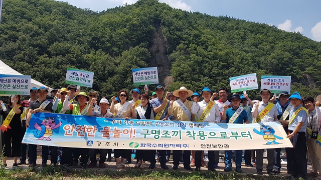 이날 한수원은 경주시 및 유관단체와 함께 청룡폭포 피서객을 대상으로 물놀이 안전수칙 홍보를 하며 아동용 물놀이 안전용품을 나눠 주는 등 물놀이 안전사고 예방 캠페인을 펼쳤다.
