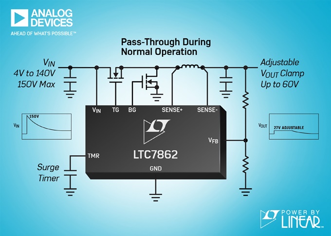 LTC7862는 LTC4363 같이 널리 사용되고 있는 선형 서지 스토퍼를 기반으로 설계됨으로써, 트랜션트나 고장이 발생했을 때 출력 전류 성능을 확장하고 전력 손실을 줄일 수 있도록 고효율 스위칭 보호 기능을 제공한다. 긴 유도성 전력 버스에서 부하 전류가 갑자기 달라지면, 전원 전압이 순간적으로 상승한다. 이런 상황은 자동차 애플리케이션에서는 얼터네이터의 인덕턴스에 저장된 에너지에 의해 더욱 악화돼 부하 덤프 기간 동안 더 높고 확대된 전압 서지 현상을 유발할 수 있다.