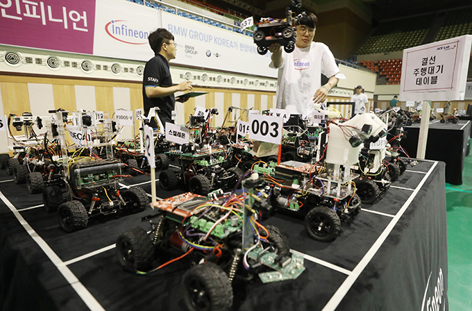 '2018 지능형모형차대회'에서 참가자들이 모형차 주행 결선 준비를 하고
