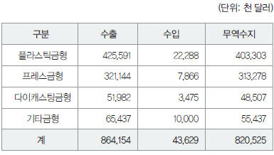 이같이 척박한 국내 경영환경 속에서도 2018년 1/4분기 금형 수출은 지난해 동기 대비 10.7% 증가한 8억 6,415만 달러를 기록하는 한편, 수입은 4,362만 달러, 무역수지는 8억 2,053만 달러 흑자를 기록하였다.