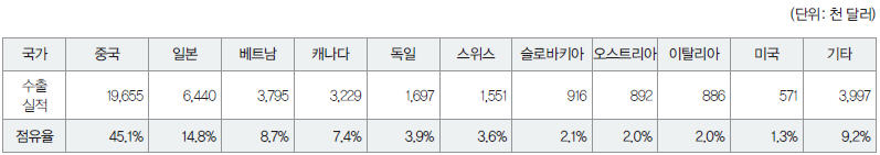 지난 2년 연속 1위를 기록한 일본은 1억 1,547만 달러를 수출하며 2위에 머물렀으며, 지속적인 수출 하락세를 보였던 중국은 ‘중국제조 2025’ 등 제조업 부흥 정책에 힘입어 경기가 개선됨에 따라 9.1% 상승한 1억 558만 달러를 기록해 그 뒤를 이었다.