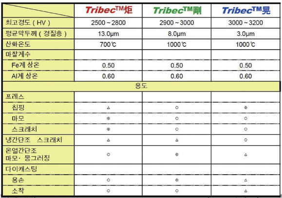 Cr계 Tribec Takeru, Tribec Hikaru는 범용이면서 제조/프레스, 다이캐스트에 적합하고, 내열성과 내마모성이 좋다. 피막구조는 AlCrSiN계로, 내마모성(경도)가 TiAIN과 CrN보다 우수하고 산화온도가 TiAIN과 CrN 보다 높다. 밀착성 역시 TiAIN과 CrN보다 월등하다.