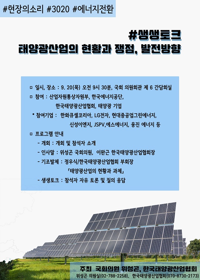 2018년 9월 20일 오전 9시 30분, 국회의원회관 제 6 간담회실에서 개최되는 간담회에는 산업통상자원부, 한국에너지공단, 한국태양광산업협회와 협회 회원사인 한화큐셀코리아, LG전자, 현대중공업그린에너지, 신성이엔지, JSPV, 에스에너지, OCI, 웅진에너지 등이 참여해 발제할 계획이다.