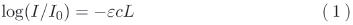여기에서 I/I0는 투과율, ε는 몰 흡광계수이다. 즉, 측정부 길이가 일정할 때 투과율을 측정하면 몰 농도 c를 구할 수 있다.