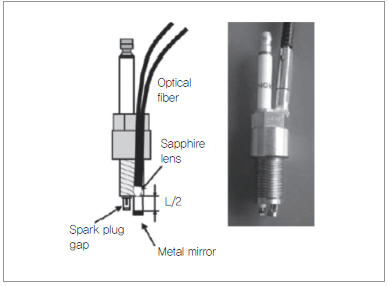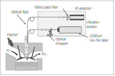 저자 등이 개발한 시스템에서는 가솔린 엔진의 실린더에 삽입되는 점화 플러그에 적외흡수법을 이용한 센서를 설치, 점화 플러그 근방의 탄화수소 연료 농도를 계측한다. 연료 농도 계측에는 파장 3.392μm의 적외 He-Ne 레이저를 이용하고, 점화 플러그에 매립한 광학계까지 광파이버로 이들 적외광을 이끌었다. 이 시스템은 점화 플러그 근방의 국소적인 농도를 측정하는 것을 목적으로 하고 있으며, 점화 플러그에 설치된 광학계는 미러에 의한 더블 패스 방식으로 정도를 확보했다.