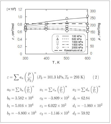 적외흡수법에 의해 연료 농도를 계측하기 위해서는 식(1) 중의 연료는 몰 흡광계수 ε가 필요하다. 고옥탄 가솔린의 흡광계수를 그림 3에 나타냈다. 여기에서 그림 3의 가로축은 온도를 나타내고, 세로축은 몰 흡수계수를 나타내고 있다. 실험값을 플롯으로, 실험값에서 구한 압력·온도에 관한 근사식 (2)로부터 계산한 결과를 선으로 나타냈다. 이들 값을 이용해 광학계 조립형 점화 플러그에 의해 검출한 투과율로부터 Lambert-Beer의 법칙에 의해 연료 농도를 계측하는 것이 가능해진다.