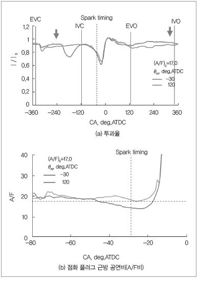 연료로 레귤러 가솔린을 이용한 경우의 투과율 및 광학계 조립형 점화 플러그에 의해 얻어진 점화 시기 직전의 공연비를 나타냈다(그림 4). 설정 공연비는 17.0,엔진 회전수는 2000rpm이고, 연료 분사 시기(θinj)를 흡기 행정 중 상사점에서 30도 전과 120도 후로 변경함으로써 연료가 가솔린 내 유입하는 모습을 변화시켰다. 그림 4에 나타낸 EVC 등은 EVC(배기 밸브 클로징 시기), IVC(흡기 밸브 클로징 시기), EVO(배기 밸브 오픈 시기), IVO(흡기 밸브 오픈 시기)를 나타내고 있다.