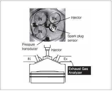 여기부터는 실제 기기 엔진의 계측 예를 소개한다. 사용한 엔진은 보어×스트로크가 70×58mm, 배기량 223cc, 압축비 9.5의 냉각 4사이클 단기통 2밸브의 자동 이륜차용의 것이다. 배기관의 스로틀 밸브 직후에 분사 밸브를 장착, 가솔린을 흡기관에 분사하고 있다. 실린더에는 압력 변환소자를 장착하고 있다.
