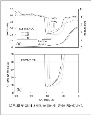 그림 7에 연료 분사 시기를 3조건(EOI:52,48,44deg.BTDC)으로 변화시켰을 때의 투과율, 실린더 내 압력, 공연비를 나타냈다. 여기에서 EOI(End of injection)는 분사 종료 시기를 나타내고, ATDC(After top dead center)는 하사점을 나타내고 있다. 이것은 100사이클의 평균값이다. 각각의 연료 분사 시기에 대응해 투과율의 감쇠 시기가 변화했는데, 공연비는 최소 8~12로 어느 것이나 농도 짙은 혼합기가 점화 플러그 근방에 형성되어 있는 것을 알 수 있다. 분사 기간 중 점화 플러그 부근을 연료가 통과하면 투과율은 감소한다. 점화 후 측정 영역을 화염이 통과, 연료가 연소함으로써 투과율은 급격하게 증가한다.