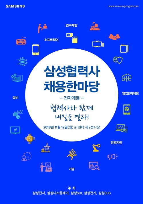 삼성전자는 삼성디스플레이·SDI·전기·SDS 와 함께 다음달 12일 서울 양재동 aT센터에서 전자계열 협력사 120여개가 참여하는 ‘2018 삼성 협력사 채용 한마당’을 개최한다.