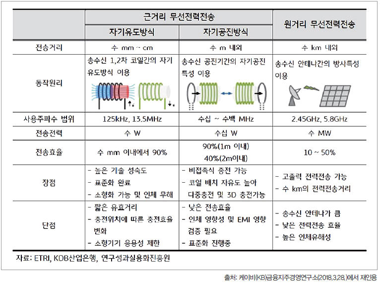 ▲ 표 1. 무선전력 전송 기술에 따른 주요 특징