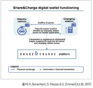 독일의 제2 에너지 기업인 RWE (Rheinisch-Westfaelisches Elektrizitaetswerk)와 슬록잇의 협력으로 만들어진 전기자동차 충전 결제 시스템(무 계약)은 과금 시스템과 관련한다. 이를 다루는 “블록 충전(Block Charge)”프로젝트의 목적은 중개인을 통한 어떤 계약도 필요 없는 충전 결제 시스템의 구축이다. 그림 2는 이 시스템의 플랫폼 구조를 도식화한 것인데, 공유 및 충전 플랫폼으로서 디지털지갑 기능을 하는 것으로 표현되어 있다. 물리적 교환은 실선으로, 정보 및 금융 거래는 점선으로 표시되어 있다.