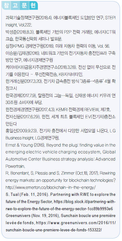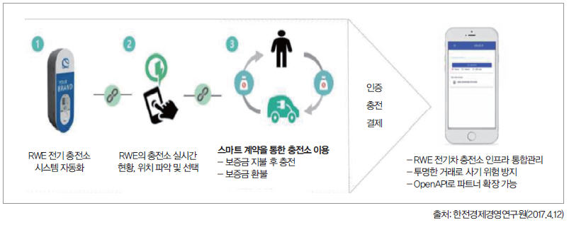 이상의 언스트앤영 보고서를 기반으로 국내 비즈니스모델들을 검색해보니, 가장 먼저 보이는 기사는 2017년 중반 한국전력공사가 발표한 블록체인 전기차 충전소 계획이다. 한전 ICT인프라처와 전력연구원 공동으로 ‘블록체인 서비스 플랫폼 기반 구축’ 사업을 시작했고, 충전소 데이터 관리와 충전 서비스 대외 업무 처리, 충전 이용 고객 지원 서비스 등 전 분야에 블록체인을 적용한다는 계획이다.