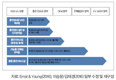 그림 6을 살펴보면, 충전장비 제조업은 충전장비를 제작, 판매 공급하는 하드웨어 사업이며, 충전장비 설치 및 유지관리 서비스는 충전장비 설치 및 유지관리 기업이 담당하며, 이 두 가지 사업유형은 주로 충전 인프라 영역에 국한된다. 한편, 제조, 설치 및 운영 관리되고 있는 복수의 충전장비를 갖춘 충전소를 운영하면서 전기차 이용자에게 충전 전력 공급을 관리하고 충전요금을 과금 하는 충전서비스 기업은 충전장비의 제조, 설치, 운영 관리하는 업무조직을 직접 소유할 수도 있고 외부 위탁, 또는 해당 업무를 수행하는 업체와의 파트너십을 가질 수 있다. 이 영역 내에서의 비즈니스 활동은 충전소 유지관리 및 네트워크 서비스, 차량 내 충전 인프라 정보시스템, 모바일, 웹 기반 소비자 포털 서비스, 충전, 충전소 네트워크의 과금 관리, 충전소 네트워크 계량시스템 관리, 충전소 네트워크 관리 소프트웨어 제작, 판매, 스마트그리드 인터페이스 관리 등이다.