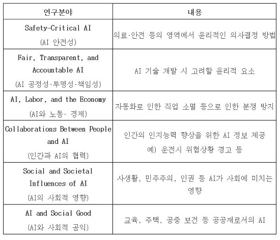 PAI의 주요 연구분야는 △ AI의 안전성(Safety-Critical AI) △ AI의 공정성∙투명성∙책임성(Fair, Transparent, and Accountable AI) △ AI와 노동∙ 경제(AI, Labor, and the Economy) △ 인간과 AI의 협력(Collaborations Between People and AI) △ AI의 사회적 영향(Social and Societal Influences of AI) △ AI와 사회적 공익(AI and Social Good) 등이다.