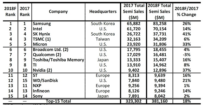 시장조사기관 IC인사이츠가 11월에 발표한 보고서에 따르면, 상위 15개 반도체 회사의 매출은 2017년 대비 2018년 18% 증가할 것으로 예상된다. 이는 2018년 매출이 2017년 대비 16% 증가한 수치 보다 2% 상승된 성과다. 상위 15개 반도체 기업은 지역별로 미국(7개), 유럽(3개), 한국(2개), 일본(2개), 대만(1개)에 위치하고 있다. 브로드컴의 경우에는 2018년 4 월 초에 본사 위치를 싱가포르에서 미국으로 이전했기 때문에 미국 기업으로 분류된다.