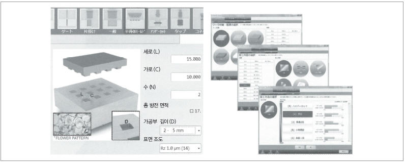 그 한 예로서 형조 방전가공기에서는 리브, 게이트, 언더컷, IC 몰드 패키지, 커넥터 등의 전극 형상이 그림으로서 준비되어 있다. 전극 형상을 선택하면, 필요한 데이터 항목만 표시되기 때문에 헤매지 않고 조작할 수 있다. 또한 정도나 속도가 중요시되는데, 화면에서 우선도를 간단히 변경할 수도 있다. 또한 프로그램을 작성할 때, 과거의 프로그램을 유용해서 가공 위치나 가공 깊이만을 변경하는 케이스도 많다. 그래서 한번 작성한 프로그램을 템플레이트(모형 프로그램)으로 등록할 수 있게 했다. 템플레이트는 최대 10종류까지 등록할 수 있다.
