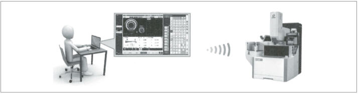 장기간의 가공을 하고 있는 경우나 여러 대의 기계를 조작하고 있는 경우, 가공의 진척 상황이나 알람이 울리지 않았나를 확인하기 위해 몇 번이나 기계 앞으로 이동하는 것은 매우 번거롭다. 이 문제를 해결하기 위해 네트워크 접속한 퍼스널컴퓨터 등에서 원격으로 형조·와이어 방전가공기의 화면을 표시·조작하기 위한 기능 ‘HyperConnect’(그림 4)를 개발했다. 이 기능은 조작 화면의 이미지를 리얼타임으로 표시할 수 있고, 오퍼레이터는 기계로부터 떨어진 장소에 있어도 퍼스널컴퓨터로 가공의 진척 상황을 확인 혹은 조작하는 것이 가능하다. 또한 기계에서 퍼스널컴퓨터로 액세스도 가능하기 때문에 퍼스널컴퓨터 상의 도면이나 작업지시서를 기계 상의 화면에서 참조할 수 있다.