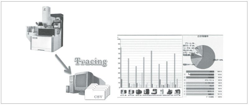 공장에 여러 대의 기계가 설치되어 있는 경우, 기계의 가동 상황을 확인할 수 있으면, 효율적으로 기계를 운용할 수 있다. 이들 데이터는 네트워크로 접속한 퍼스널컴퓨터 등의 외부장치에 CSV 형식으로 출력할 수 있고, 필요에 따라 퍼스널컴퓨터의 시판 소프트웨어 상에서 그래프화하는 것도 가능하다(그림 6). 또한 정보 관리 소프트웨어 ‘MPmax’를 이용하면, 방전가공기에 한정하지 않고 머시닝센터도 포함한 동사 기계의 가동 상황을 그래프화된 화면으로 확인할 수 있다.