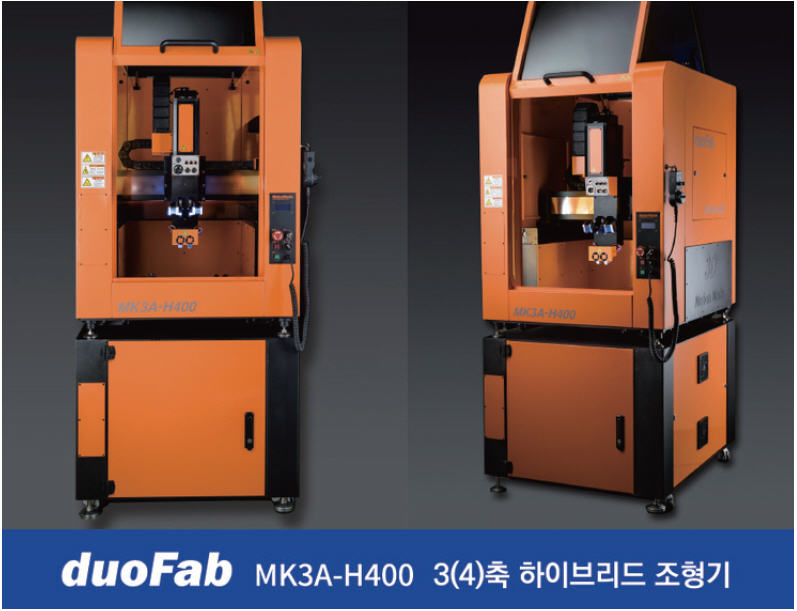 A. 저희는 개별의 CNC 조각기와 3D프린터뿐 아니라 두 장비를 일체화해 보다 복잡하고 정교한 구조의 3차원 조형을 실현한 하이브리드방식 3차원 모형조형기를 가져왔습니다. ‘duoFab MK시리즈 하이브리드조형기’는 볼 스크류, LM가이드가 적용된 정밀 이송기구와 서보모터 및 NC제어기 등으로 이뤄진 고속위치제어시스템을 기본으로, CNC 밀링조각기용 고출력 전용스핀들, 그리고 FDM방식 3D프린터용 노즐헤드와 CMM 방식을 응용한 3D스캐너용 다중위치 감응방식 터치프로브를 통해 세 가지 전문적 기능을 하나의 장비로 실현한 복합조형기입니다.