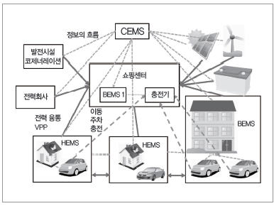 단독주택에는 HEMS(Home Energy Management System)가 설치되어 있으며, 그 중 일부는 전기자동차를 소유하고 있다. 또한, 맨션이나 빌딩에는 BEMS(Building Energy Management System)가 배치되어 있다. 여기에서 굵은 실선은 에너지의 왕래를 나타내고, 쇄선은 교통 흐름을 나타내며, 점선은 정보의 결합을 나타낸다. HEMS-HEMS 사이에서 Peer to Peer(P2P)의 전력 에너지 융통이나 전기자동차의 배터리를 이용한 Virtual Power Plant(VPP) 서비스가 블록체인 기술에 기초해 가동된다. 각 가정에서는 쇼핑센터에 쇼핑하러 가고, 또한 거기에서는 급속 충전기를 이용할 수 있다.