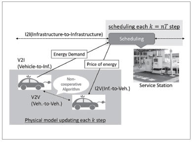 이 연구에 이용되는 스케줄링 문제의 개요를 그림 2에 나타냈다. 각 충전 스테이션은 동일한 관리자에 속하는 것으로 하고, 충전 스테이션 간의 통신(I2I)를 이용해 상호의 정보를 교환한다. 각 스테이션은 스케줄링 시간 k=nT(n=1, 2, ...)에 충전 가격을 각 차량에 제시하고, 각 EV는 가격을 바탕으로 원하는 충전 수요량을 충전 스테이션에 제시한다.