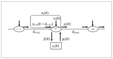 는 노드 i에 있어 모델 외부에서 유입해 오는 EV 수, yi-1(k)는 노드 i-1를 시간 k에서 출발한 EV 수, di-1,i는 노드 i-1에서 노드 i까지의 소요 시간이다. 또한, yi(k)는