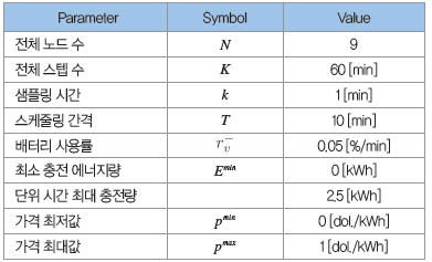 는 단위 시간의 주행에 필요한 SOC이다. Ev, i는 EVν가 노드 i에서 충전하는 에너지량,μν>는 배터리 용량이다. 충전에서 각 EV는 이하의 2가지 제약 조건을 충족시키는 것으로 한다.