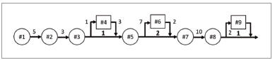 시뮬레이션 조건을 표 1에 나타냈다. 시뮬레이션 프로그램 대상을 토메이 고속도로의 도쿄-나카이 서비스 지역 간의 9노드분으로 했다. 그림 4는 시뮬레이션 대상을 노드화한 모델이다. 동그라미가 인터체인지, 네모가 충전 스폿을 가지는 서비스 지역, 인터체인지와 서비스 지역 사이의 숫자는 이동 소요 시간, 서비스 지역 아래의 굵은 서체의 숫자는 스테이션에 존재하는 EV 충전기 수를 나타낸다. 또한, 슈타켈베르크 게임의 이터레이션 횟수는 300[step]으로 했다. 외부에서 모델 내부로 유입되는 차량 수